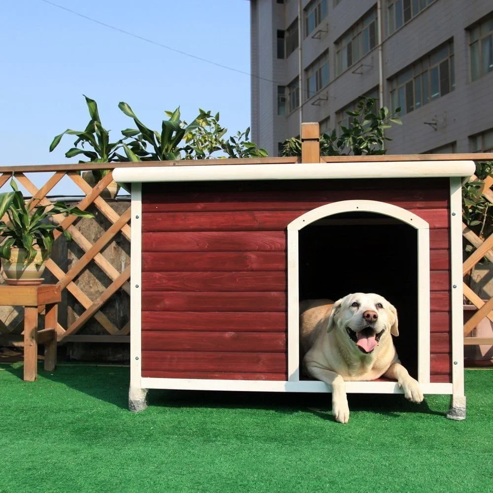 - с плоской крышей (наклон в противоположную от фасада сторону), на которой собака может лежать;