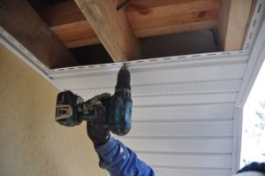 - Оставить зазор между стенами и внутренней подшивкой свеса. Если карниз отделан профнастилом, то зазор делается не больше 1,2 см, если же карниз из сайдинга, то до 1,5 см.
