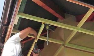 При обшивке деревянного свеса необходимо оставлять щели в 1-1,5 см между досками для вентиляции. На широких карнизах дома доски прибиваются в трёх местах, для узких достаточно забить гвозди только с двух сторон. При продольном монтаже доски закрепляются каждый метр.