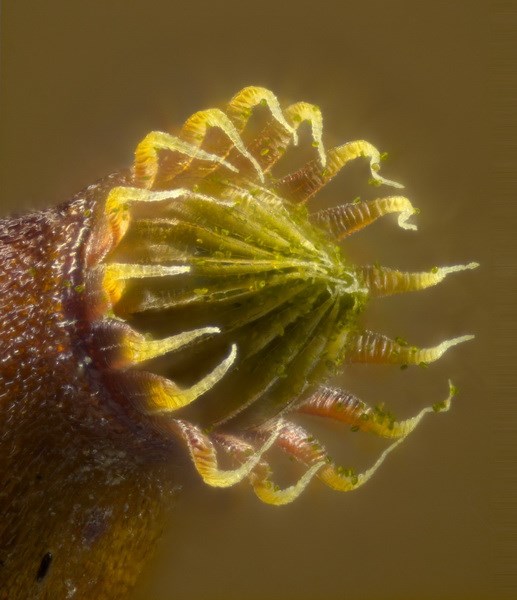 У двудомных мхов побеги с мужскими гаметангиями растут отдельно от женских. Гаметангии у мхов обычно располагаются группами. Они либо окружены листовидными выростами и располагаются на верхушке гаметофита, как у листостебельных мхов, либо, как у печёночников, например у маршанции многообразной, находятся на специальных подставках — выростах слоевища. В архегониях образуются женские гаметы — яйцеклетки, в антеридиях мужские гаметы — сперматозоиды (антерозоиды). Чтобы произошло оплодотворение, необходима вода. Капля дождевой воды, падая с мужского растения на соседнее женское, помогает сперматозоиду попасть к яйцеклетке. Происходит оплодотворение, и внутри архегония образуется зигота*. Из зиготы, прямо на верхушке женского гаметофита, спустя некоторое время (обычно год) развивается спорофит — бесполое растение, получающее питание от гаметофита. Если вы обратите внимание на мох в конце весны — в начале лета, то заметите рыжевато-бурые булавочки спорофитов.