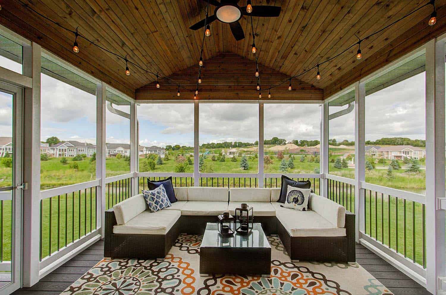 Предусмотрите побольше окон на закрытой террасе: в особо теплые дни их можно оставить открытыми и получить все преимущества на свежем воздухе. Кроме того, щедрое остекление обеспечит прекрасный обзор — и вы сможете обозревать все деревья и растения.
